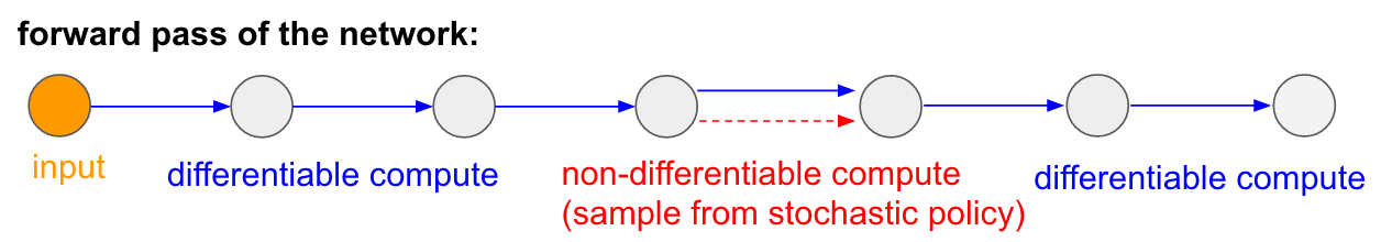 Policy gradients to the rescue! We’ll think about the part of the network that does the sampling as a small stochastic policy embedded in the wider network. Therefore, during training we will produce several samples (indicated by the branches below), and then we’ll encourage samples that eventually led to good outcomes (in this case for example measured by the loss at the end). In other words we will train the parameters involved in the blue arrows with backprop as usual, but the parameters involved with the red arrow will now be updated independently of the backward pass using policy gradients, encouraging samples that led to low loss. This idea was also recently formalized nicely in Gradient Estimation Using Stochastic Computation Graphs.